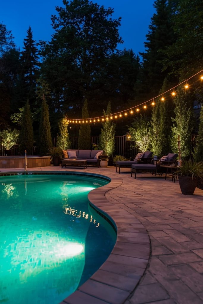 Lighting can completely transform your space after sunset. I always recommend layering different types of pool deck lighting ideas for both function and mood.