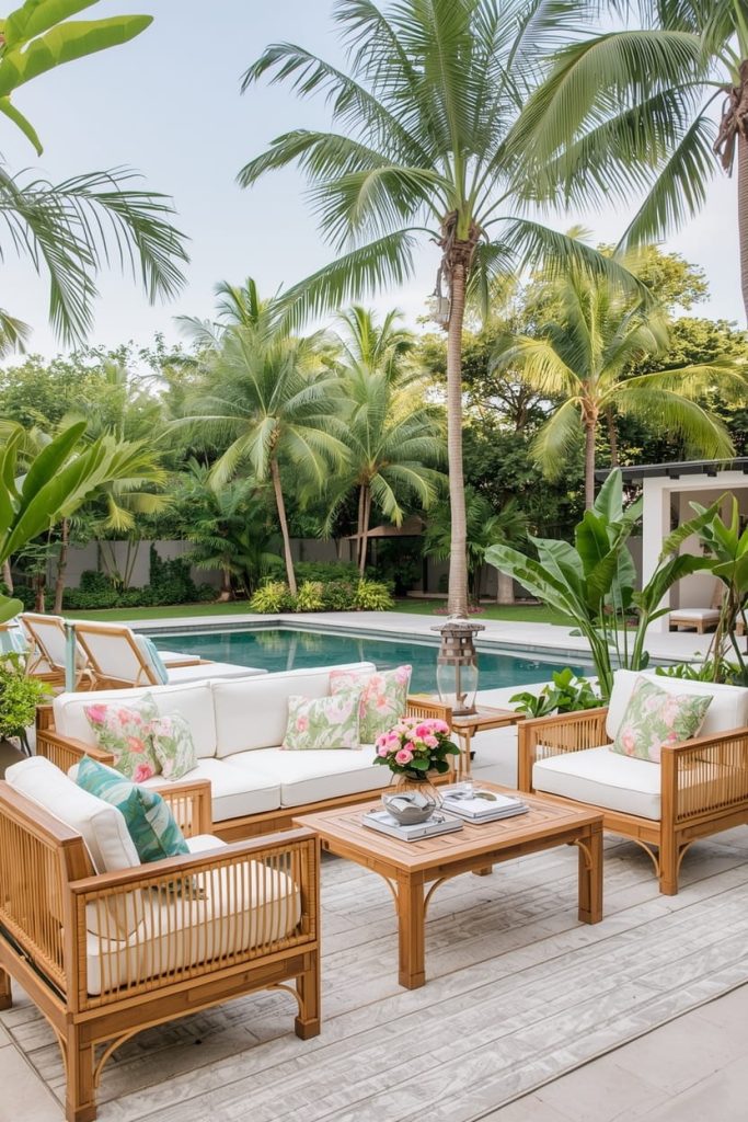 Think bamboo furniture, palm plants, and light, airy fabrics. These elements instantly transform your space into a resort-style pool deck.