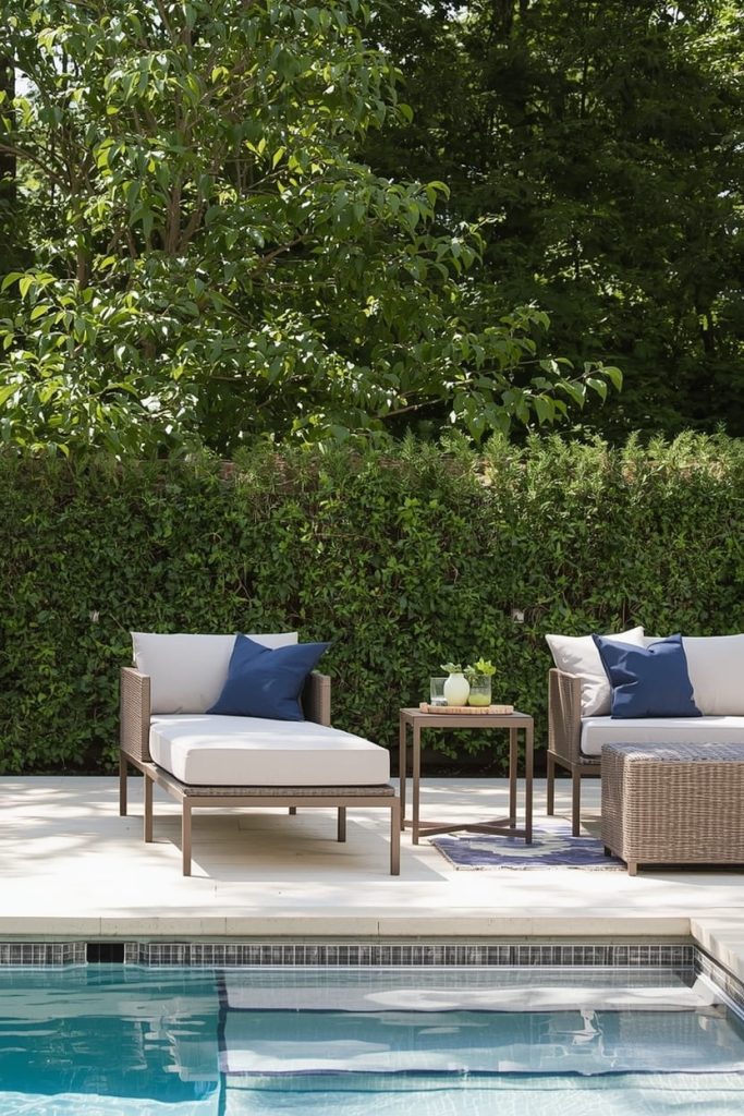 Look for weather-resistant materials like wicker, aluminum, or teak. Add cushions for a cozy touch and to enhance your poolside decor inspiration.