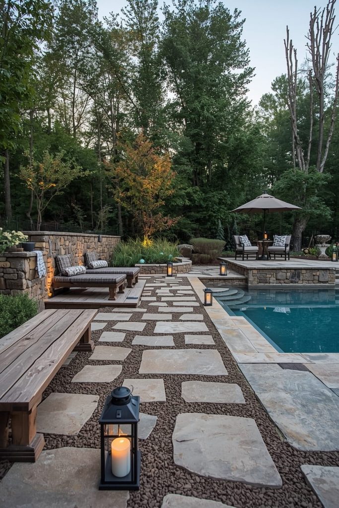 There’s something warm and inviting about a rustic pool deck design. I like using wood textures and earthy tones to create a grounded, cozy feel.
