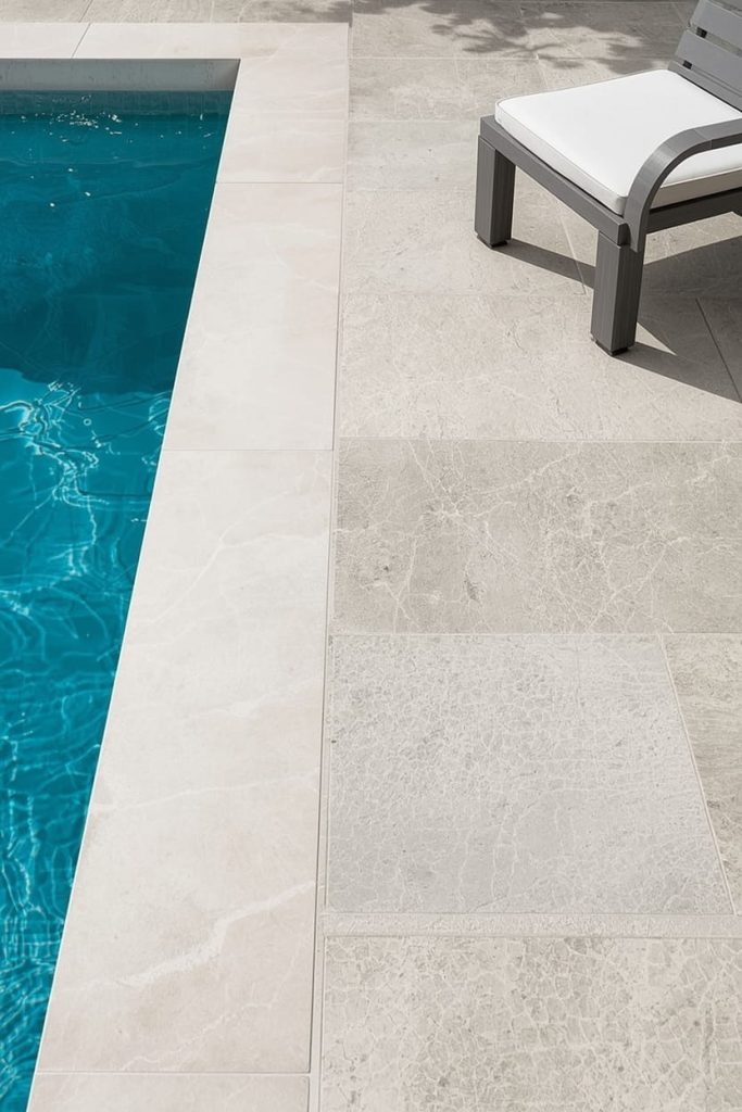 Tile is one of my favorite modern pool deck flooring ideas because it offers a clean, polished finish. Porcelain outdoor tiles are especially strong and resistant to moisture, which makes them perfect for pool environments.