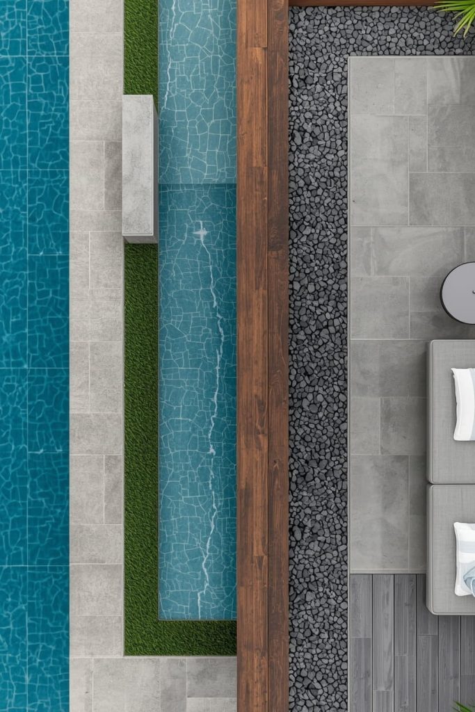 One of my favorite modern pool deck flooring ideas is mixing multiple materials. Hybrid designs allow me to combine stone, wood, turf, and tile into one cohesive layout.