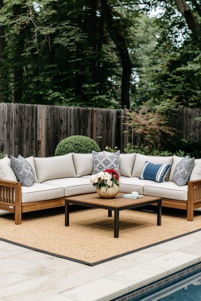 For a more relaxed vibe, I love using backyard pool furniture inspiration centered around sectional sofas. It turns the pool deck into a true outdoor living room where everyone naturally gathers.