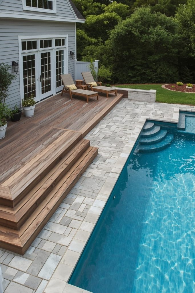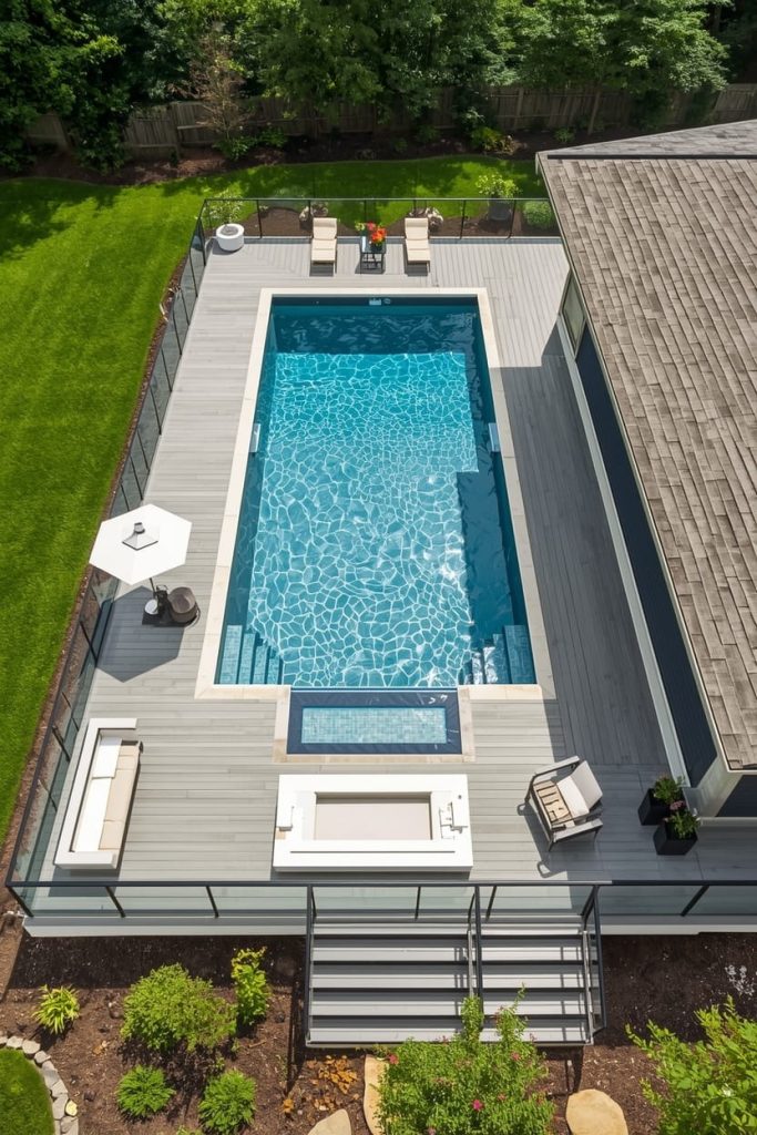 I’ve seen incredible transformations using a multi-level deck rectangular pool. It allows you to divide your outdoor space into different zones for relaxing, dining, and swimming.