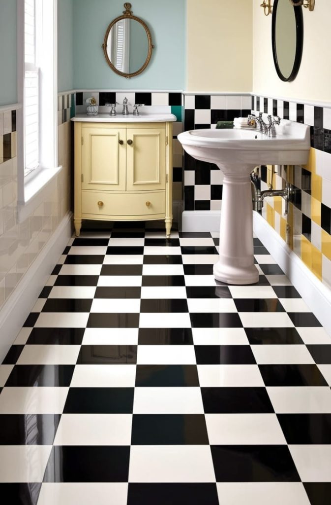 3. Install Checkerboard Flooring (Black & White or Soft Pastels)