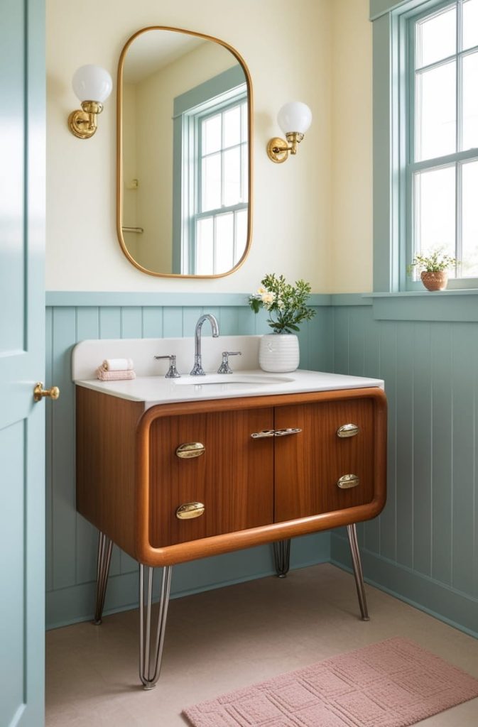A retro-inspired vanity can tie the whole bathroom together. Look for pieces with rounded edges, hairpin legs, or natural wood tones to achieve an authentic mid-century feel. Chrome or brass pulls add that final vintage touch.
