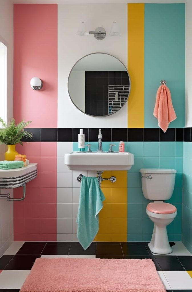 I recommend using color blocking thoughtfully: balance bold sections with neutral tones to avoid overwhelming the space. Done right, this technique gives your guest bathroom a playful, vibrant, and unmistakably retro look.