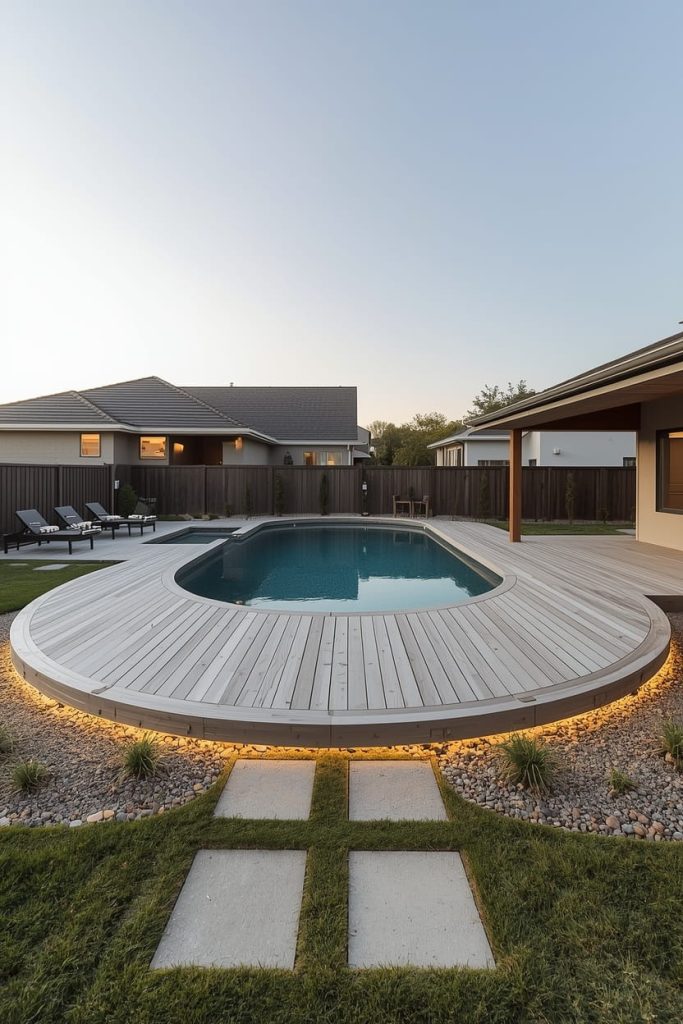 I usually recommend using composite or treated wood for a polished finish. Keeping the deck slightly raised helps define the pool space while maintaining a smooth flow into the backyard. Neutral colors like gray or natural wood tones enhance the modern aesthetic.