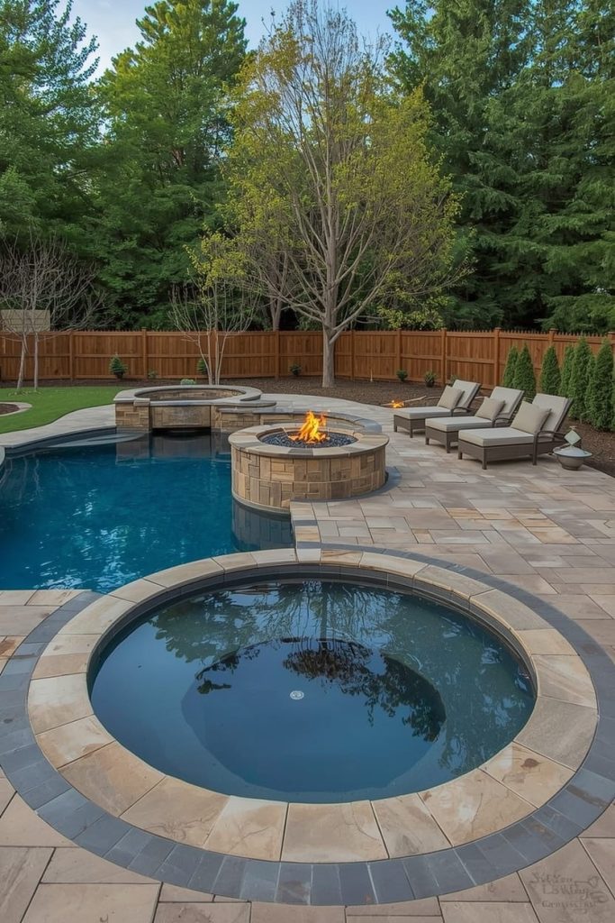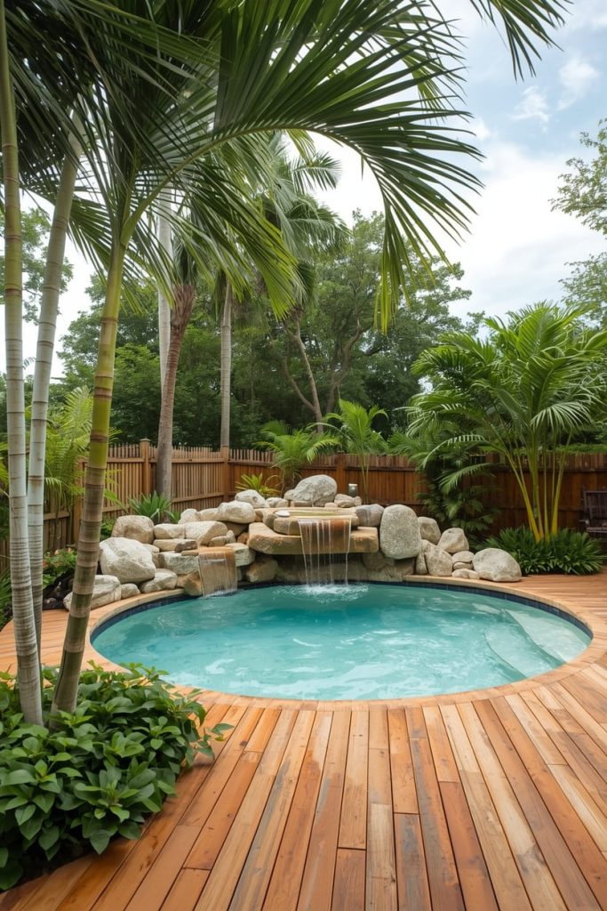 I combine natural wood decking with lush plants like palms and ferns to create a backyard oasis round pool design. The goal is to make the pool feel like it’s hidden in a tropical retreat.