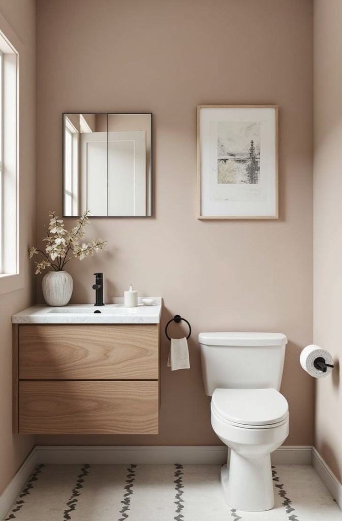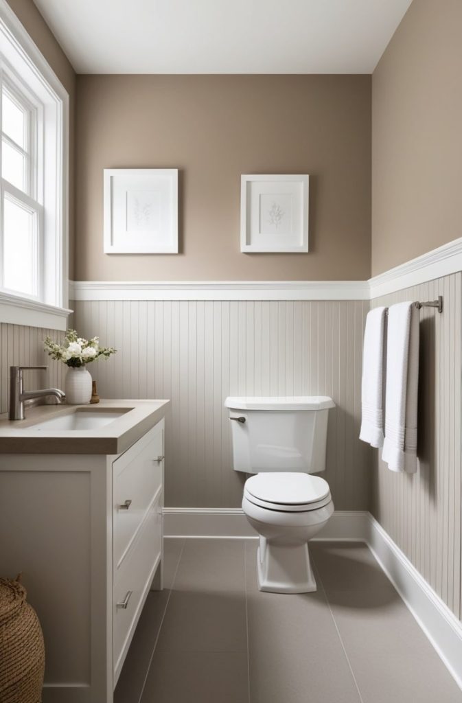 In compact spaces, greige walls prevent the room from feeling cold or dull. I often pair it with white trim, white tile, or light countertops to keep the bathroom visually open and cohesive.