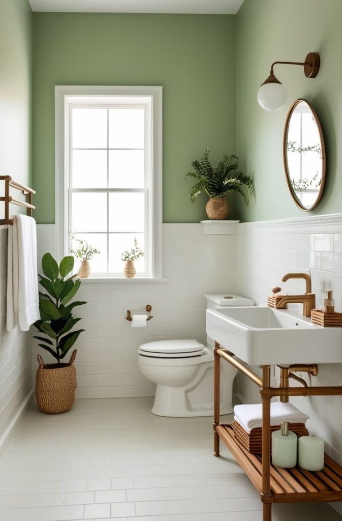 I often recommend pale green walls paired with white tile and warm metal fixtures. This keeps the bathroom bright while adding personality. It also complements plants and wood accents beautifully.