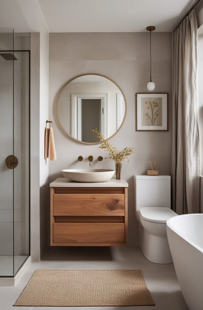I often mix warm wood vanities with soft gray tiles or off-white walls. This keeps the space calm and timeless while still feeling inviting.