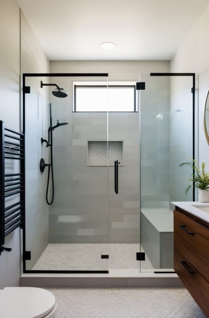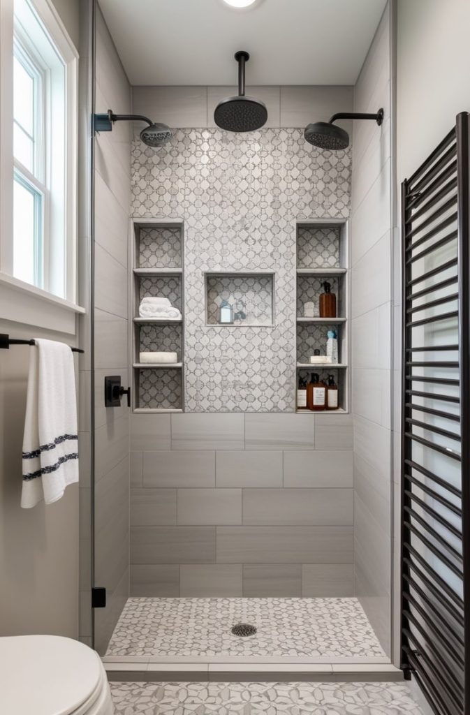 Instead of bulky shelves or caddies, I recommend built-in shower niches. They’re clean, modern, and perfect for small full bathrooms with shower setups.