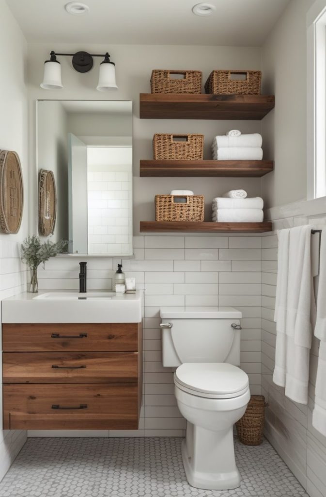 For renters or budget remodels, floating shelves are my favorite solution for small bathroom organization ideas. They’re affordable, easy to install, and visually light.