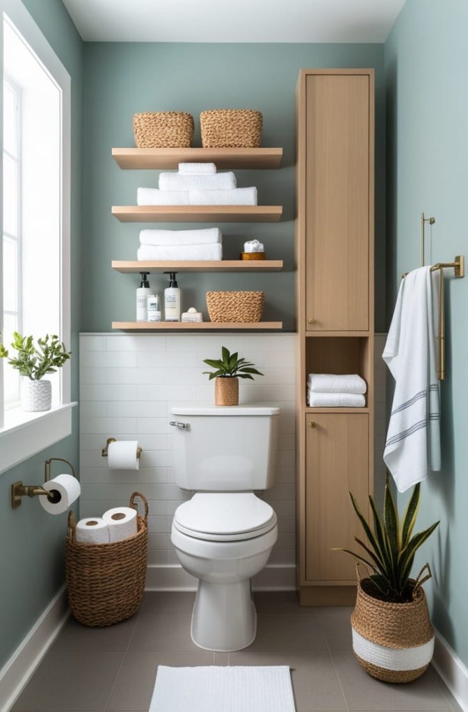 Finally, I love mixing decorative and practical items on vertical shelves—plants, baskets, extra toilet paper, or rolled towels. This approach keeps everything looking stylish and coordinated while ensuring your tiny guest bathroom stays neat.