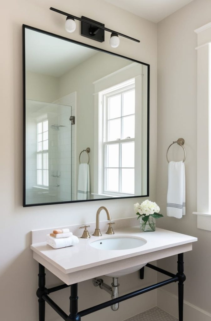 If you want your tiny guest bathroom to feel bigger instantly, a large mirror is the quickest solution. I’ve used oversized mirrors in countless small bathrooms because they reflect light, create depth, and visually expand the space. It’s one of the easiest upgrades with maximum impact.