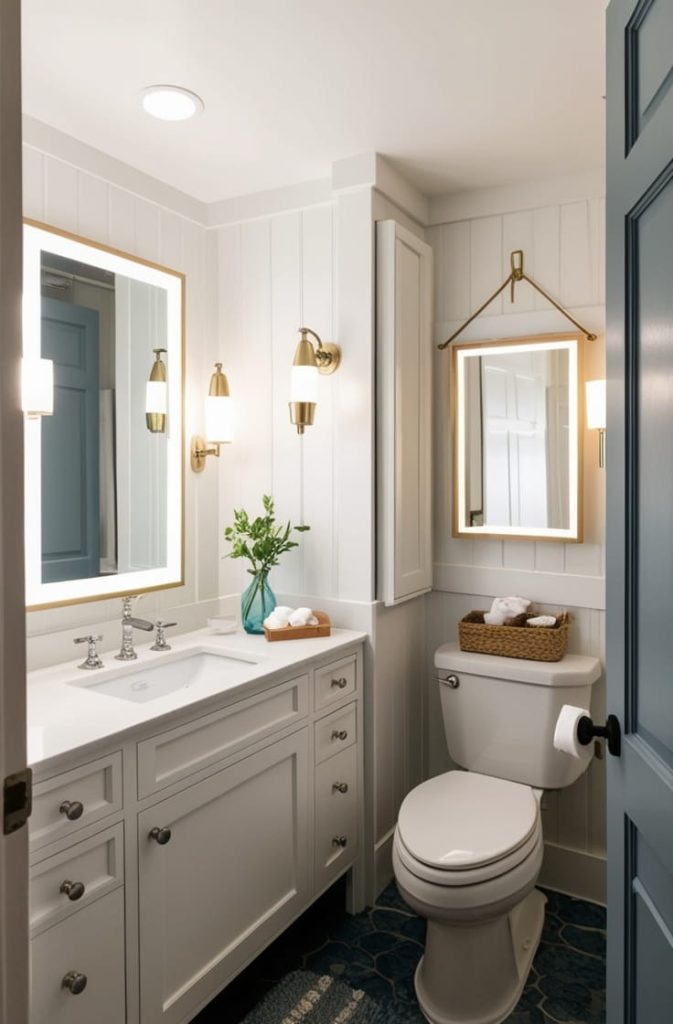 Lighting can completely transform the mood of a tiny guest bathroom. Because small spaces tend to feel darker and more enclosed, I always recommend upgrading lighting as part of any tiny guest bathroom makeover. Bright, well-placed lighting instantly opens the space.