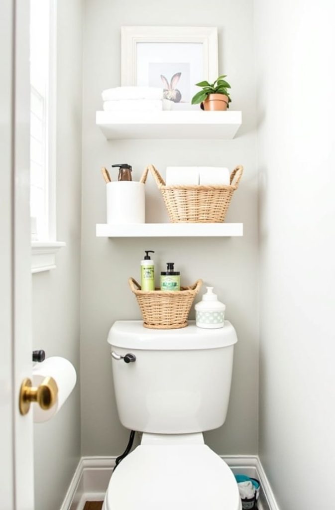 One of the most underrated tiny guest bathroom ideas is simply making use of the space above the toilet. This area is often left empty, but it’s a perfect spot for shelving, cabinets, or baskets. It provides much-needed storage without taking up valuable floor area.