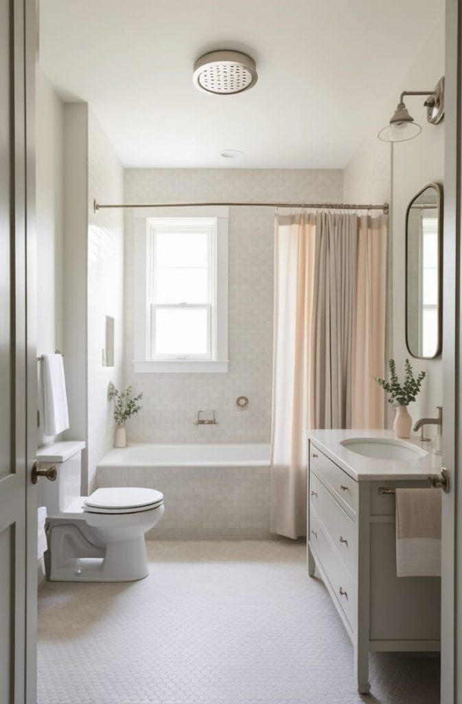Paint isn’t the only place where light colors help. Choosing light-colored tiles, vanities, shower curtains, and accessories creates a continuous flow that prevents the room from feeling visually chopped. This technique works extremely well in tiny modern guest bathrooms, where simplicity enhances the overall look.